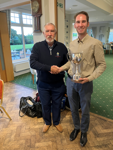 Luke Peters wins The Kestrel Cup trophy as the highest finishing Bunkers Member, receiving the trophy from Captain Dave.